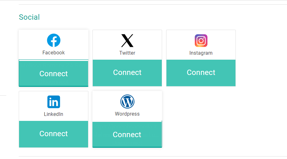 - Click the "Connect" button displayed next to each social media platform (Facebook Professional Page, X, Instagram Professional, and LinkedIn).