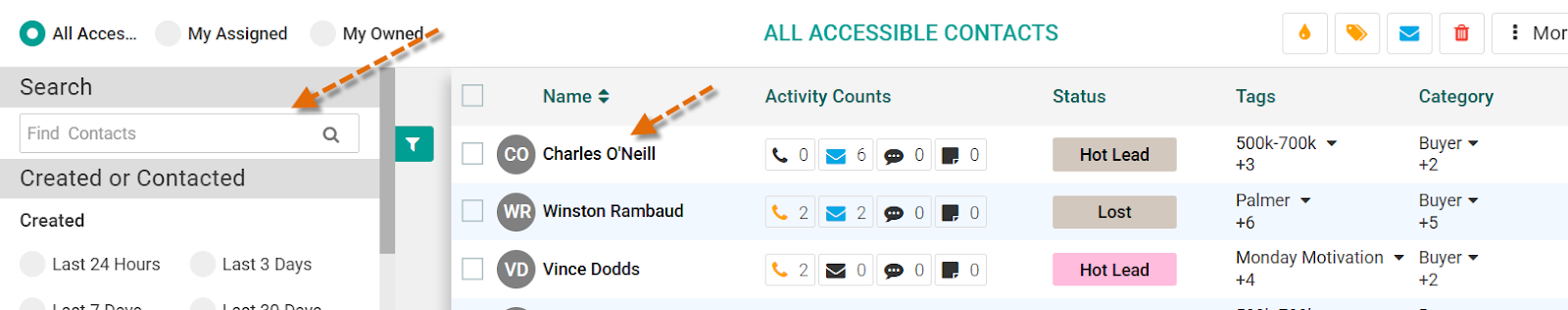 - On the Contacts page, use the search bar on the right-hand side to search for your client by name.