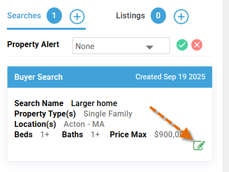 - To edit a search on behalf of the buyer, click on the pencil icon next to the specific search. This opens the search criteria, allowing you to modify it and save the updated search directly.