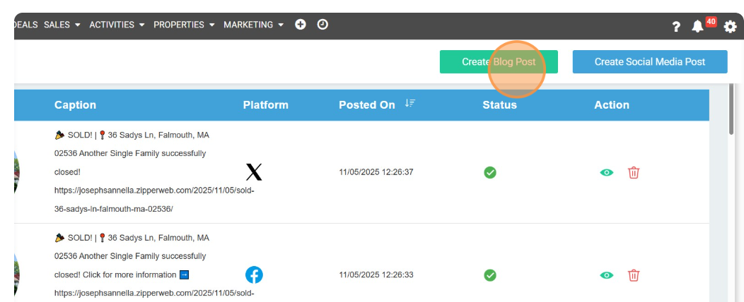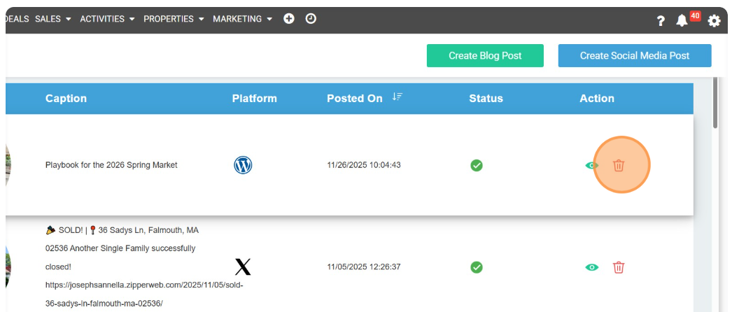 - If you need to delete the blog post, click the delete button (trash can icon) from the Blog and Social Media list page.