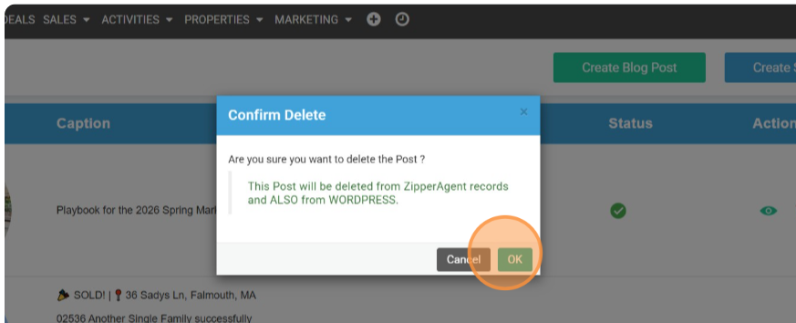 - A "Confirm Delete" dialog box will appear, noting that the post will be deleted from ZipperAgent records and also from WORDPRESS.