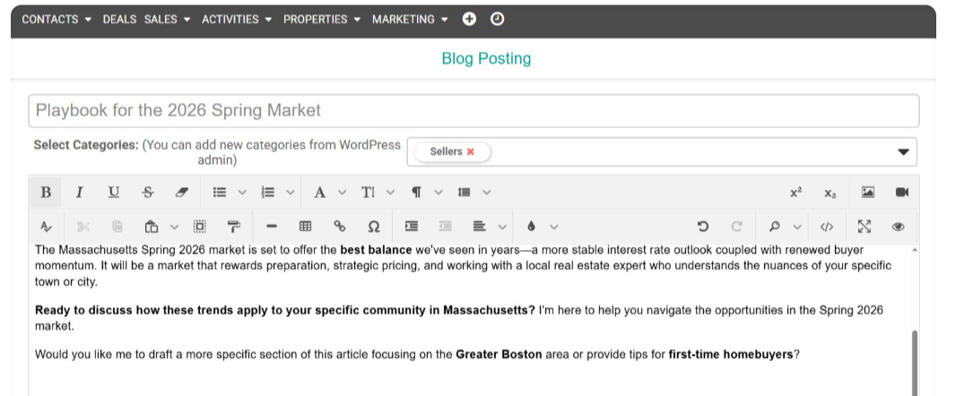Example Content: "The Massachusetts Spring 2026 market is set to offer the best balance we've seen in years—a more stable interest rate outlook coupled with renewed buyer momentum. It will be a market that rewards preparation, strategic pricing, and working with a local real estate expert who understands the nuances of your specific town or city."