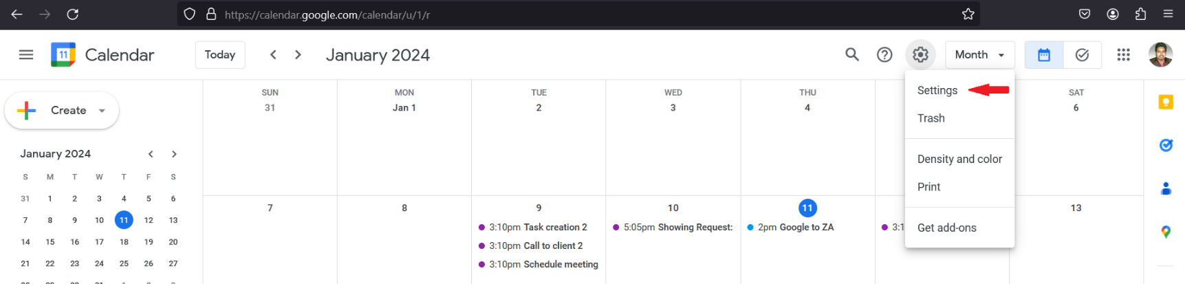 Step-3 : For URL, open google calendar in another tab of your browser. Click on Settings.