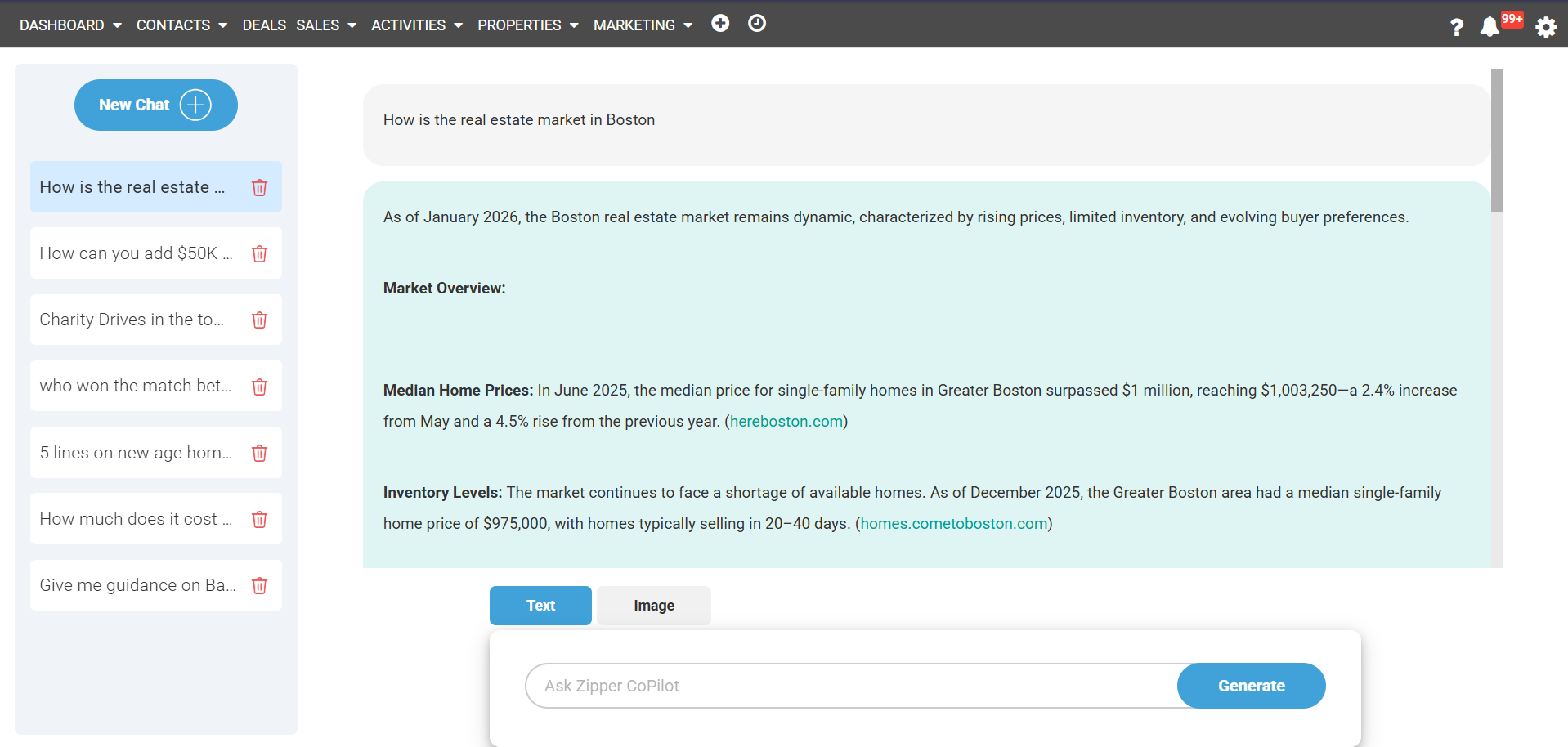 Zipper CoPilot is an AI-powered assistant designed to help real estate professionals quickly gather market data, generate blog ideas, and answer complex real estate queries directly within the ZipperAgent CRM.