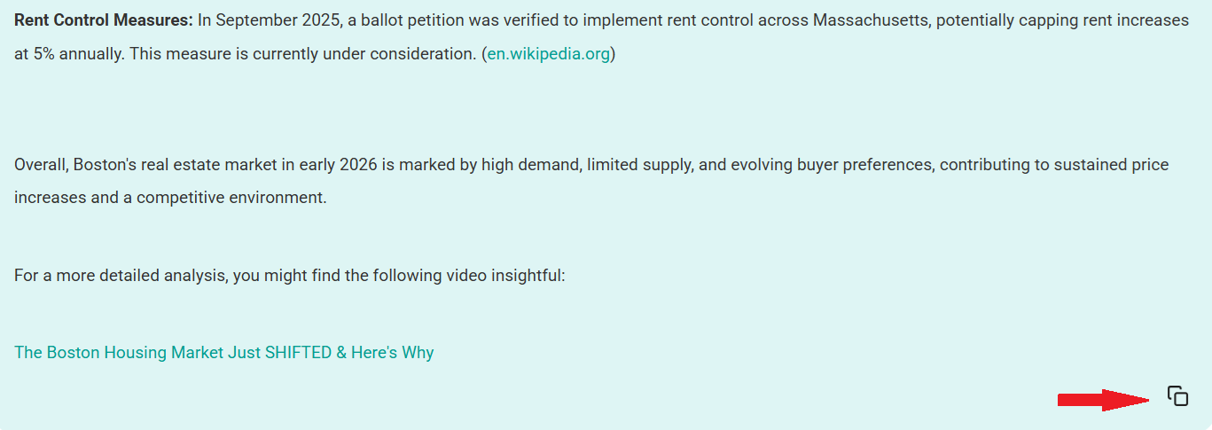- Copy Content: To use this information in an email or blog post, click the Copy icon (two overlapping squares) located at the top right of the response box.