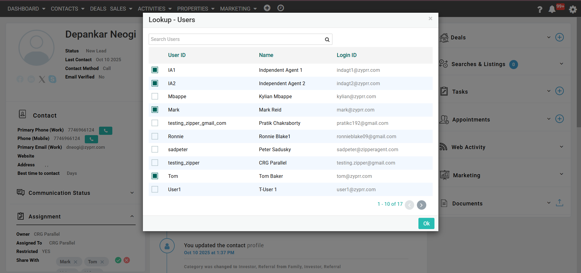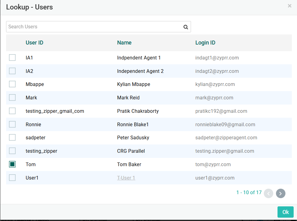 Step 03: A lookup user modal will appear on the screen where you need to select the user with whom you want to share the specific contact. You can choose multiple users to share. Click on 'Ok' once you are done.
